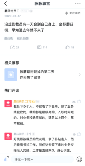 4月17日,有网友在某职场社交平台爆料称,电商平台“蘑菇街”裁员140人,占比在10%左右。对此,蘑菇街官方回应:“该消息属实,这是公司特别艰难的决定,除了N+1.5赔偿之外,公司还为这些同事积极寻求解决方案。”有相关人员表示,此次裁员就连2019年毕业的应届生也未能幸免:“整个小组只剩下组长,校招员工也不例外。”对于如此大刀阔斧的裁员,让投资人不禁对公司运营状况产生疑问,公司方面则表示,“本次优化主要集中在技术部门,这是基于业务结构的正常调整,蘑菇街将更加聚焦直播电商行业,所以优化掉部分非强相关业务。目前市场部、运营部仍在招聘。”在疫情影响下,有部分员工对于被裁员也有了更高的容忍度,表示能拿到合理赔偿已经是一个“不错”的结果。在微博上,有网友评论:宣布裁员后,蘑菇街楼下的咖啡厅是生意最好的一天,蘑菇街被裁的员工都忙着庆祝,很大一部分原因是因为蘑菇街给出的补偿非常慷慨——N+1.5,“哺乳期”2N+1.5。甚至有内部员工调侃,被裁员的员工比没被裁的员工幸运。更多的员工,则是流露出在被裁员后对于未来生活的担忧。除了疫情,到底是什么原因让蘑菇街在这个时刻大幅度裁员呢?蘑菇街算得上是中国电商的鼻祖级平台,2011年成立后,逐渐发展定位于为年轻女性提供衣服、鞋子、配饰、美妆等平价商品,深受大学生群体追捧。2016年起,蘑菇街开始发力电商直播业务,该业务逐渐成为公司业绩增长主要发力点。然而,从财报数据看,蘑菇街的直播电商虽然发展快速,但公司尚未达到盈亏平衡点。截止至2019年12月31日,财报显示,在过去的12个月,蘑菇街活跃买家数2660万,同比下降22.9%;第三季度蘑菇街直播业务营收增长低于100%。主要原因是在从电商向直播转型期间,因为在与抖音、快手等大流量直播平台的强力竞争中,蘑菇街在直播业务上并无核心优势,显得没有“存在感”。有媒体报道称,因为蘑菇街APP本身在电商APP中就显得缺乏差异化,导致在激烈竞争中岌岌可危。虽然早在2016年就转型直播,但是并没有达到先发制人的效果。据悉,目前蘑菇街除了少数头部主播还在正常工作,很多腰部主播都在寻求出路。此次疫情让蘑菇街的消费者购买力和产品供应链都受到严重影响;美股因疫情导致大幅下跌,也使得蘑菇街受到波及,供应链出现问题,加上股价大跌,成为此次大裁员的诱因。截至4月20日收盘时,蘑菇街股价为1.04美元,涨幅5.57%,总市值1.11亿美元,相比较蘑菇街上市之初的14.97亿美元市值,以及2018年年底27.5亿美元的最高值市值,缩水超九成。并且据企查查所示,自从2015年收到平安创新投资基金和天图投资的超2亿美元D轮融资后,再到2018年美股上市,此后蘑菇街再未收到任何战略投资。没有充沛的资金支持,加上低迷的股价,这也让其在与抖音、淘宝等重量级直播平台的对战中显得默默无闻。财报显示,蘑菇街去年第四季度实现营收2.695亿元,同比下降26.6%;净亏损达16.346亿元,较上年同期净亏损人民币4220万元,相比扩大37.7倍,主要原因是2016年2月收购美丽说产生的商誉减值;调整后净亏损为9560万元,2018年同期净利润为1370万元。近来,蘑菇街不仅是对基层人员进行优化调整,高层人事也在经历震荡。短短一个月内,已有至少3名高管离职。2月28日,蘑菇街发布公告称,高级副总裁曾宪杰因个人原因离职。随后,3月31日,公告称公司CFO吴婷辞职,辞职原因与高级副总曾宪杰相同。在蘑菇街“all in”的电商平台,其资深副总裁、直播业务负责人金婷婷(花名洛伊)也已于3月31日离职。而她本人也于3月31日发朋友圈表示“过去暂告一个段落”。有媒体称,金婷婷将加盟蘑菇街的竞品公司“小红书”并负责电商直播业务。对此,小红书方面作出回应称“消息不实”。