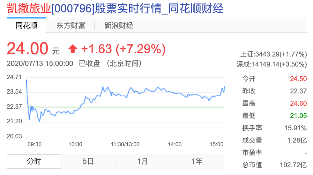 到了7月13日股价回归理性,盘中股价一度下跌,最终收盘价格为24.00元,上涨幅度为7.29%。相较于6月29日收盘价9.49元,不到半个月的时间,市值大涨117亿元。目前,凯撒旅业总市值为192.72亿元。