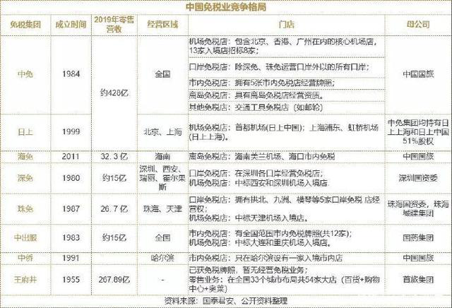 中国国内仅有八张免税牌照,其中中国国旅手上就有3张(中免(中国免税品集团)、日上(日上免税行)、海免(海南省免税品有限公司)),其他5张分别是:珠免(格力地产)、深免(深圳免税集团)、中出服(中国出国人员服务有限公司)、中侨(吉林中侨免税外汇商品有限公司)、王府井。
