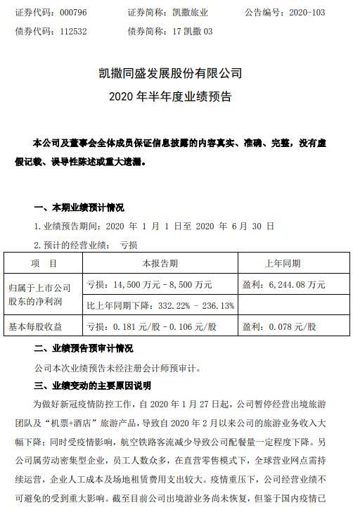 7月12日,凯撒同盛发展股份有限公司(凯撒旅业:000796,SZ)发布的2020年上半年业绩预告显示,报告期内,公司预计归属于上市公司股东的净利润亏损人民币8500万元至1.45亿元,比上年同期下降236.13%-332.22%。