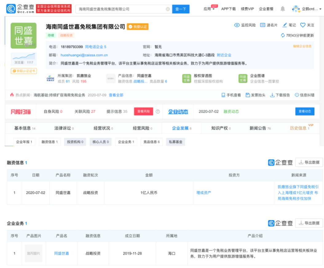 此外,据企查查显示,7月2日,凯撒旅业旗下的免税业务管理平台—海南同盛世嘉免税集团有限公司获得上海理成资产管理有限公司1亿元增资。