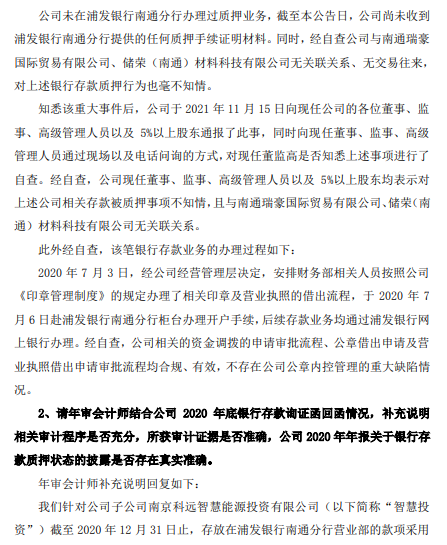 11月24日,科远智慧发布关于对深交所关注函回复的公告称,“公司未在浦发银行南通分行办理过质押业务,截至本公告日,公司尚未收到浦发银行南通分行提供的任何质押手续证明材料。”同时,经自查公司与南通瑞豪国际贸易有限公司、储荣(南通)材料科技有限公司无关联关系、无交易往来,对上述银行存款质押行为也毫不知情。