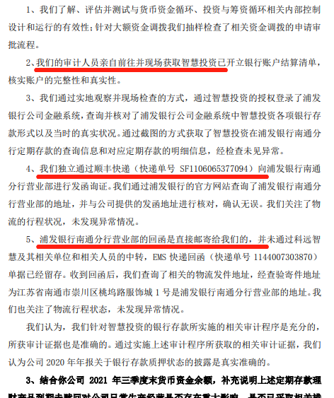 在科远智慧的公告中,年审会计师表示,“我们针对公司子公司智慧投资截至2020年12月31日止,存放在浦发银行南通分行营业部的款项采用了财政部办公厅、银保监会办公厅关于印发《银行函证及回函工作操作指引》的通知中,规定的银行询证函格式向浦发银行南通分行营业部进行了函证。”