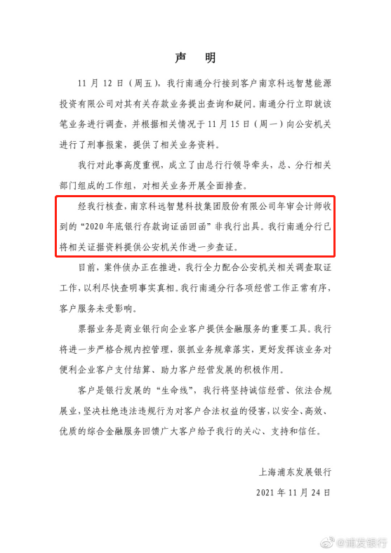 在科远智慧发布上述公告40分钟后,浦发银行也在官微发布声明:经我行核查,南京科远智慧科技集团股份有限公司年审会计师收到的“2020年底银行存款询证函回函”非我行出具。我行南通分行已将相关证据资料提供公安机关作进一步查证。目前,案件侦办正在推进,我行全力配合公安机关相关调查取证工作,以利尽快查明事实真相。