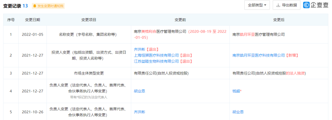 而美格利合则被转让给南京皓月环亚医疗科技有限公司。企查查显示,2021年10月开始,美格利合股东易主,原股东、法人代表全部换血,南京皓月环亚医疗科技有限公司成为新股东。